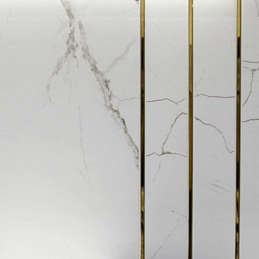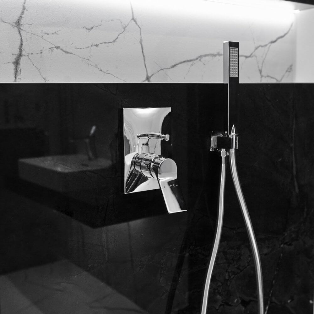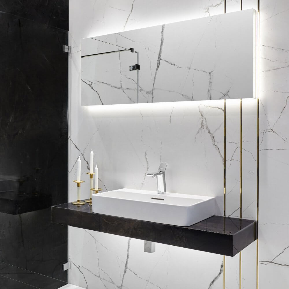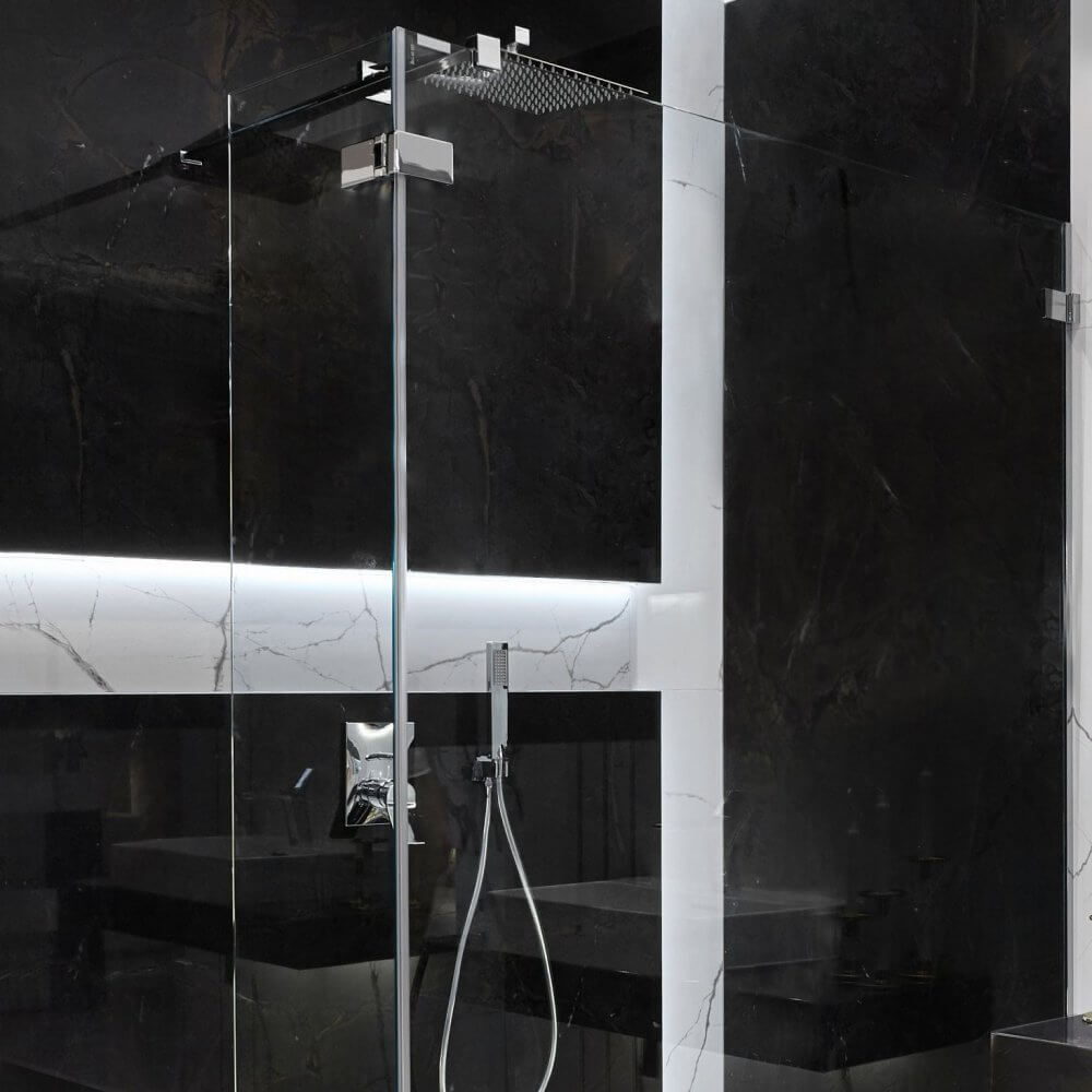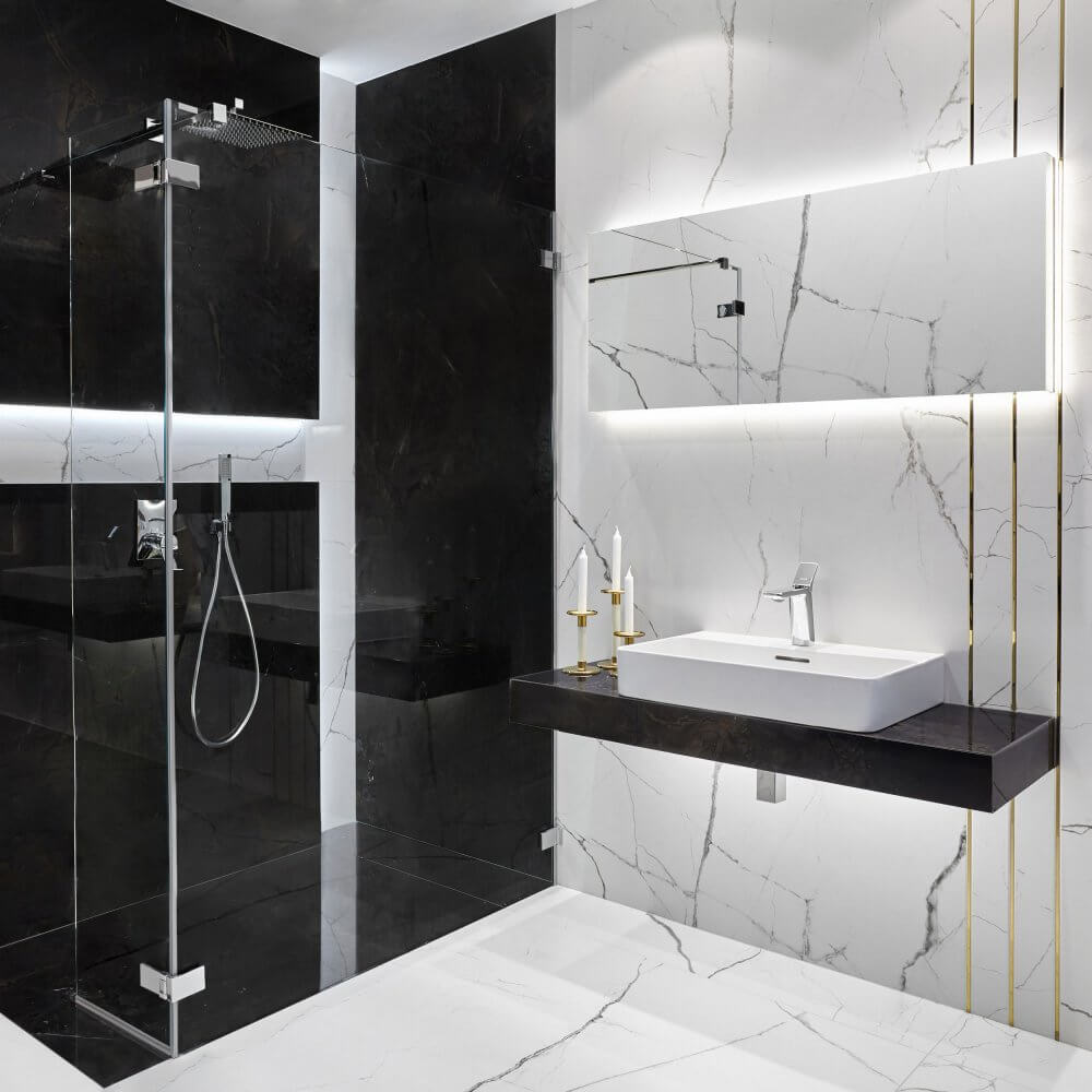 Dwa kolory – czerń i biel. Chociaż na kole barw stoją do siebie w opozycji, są duetem, który najczęściej można spotkać w projektach łazienek. Nic w tym dziwnego – są one nie tylko ponadczasowe, ale również niezwykle uniwersalne, będąc idealnym dopełnieniem aranżacji w każdym stylu. W naszej nowojorskiej łazience nie mogło więc zabraknąć ich zestawienia. Nowy Jork kojarzony jest z luksusowymi penthouseami rodem na Manhattanu – pełnymi blichtru, ale przede wszystkim z klasyczną nutą. To wszystko odnajdziesz w naszej łazience. Dominującym wzorem jest w niej kamień, a konkretnie marmur, o szlachetnym, różnorodnym rysunku użyleń. Jego zasługą są płytki ceramiczne The Room Statuario, które niezwykle realistycznie oddają wygląd naturalnego surowca. W formie kontrastu świetnie sprawdziły się zaś czarne płytki wykończone w polerze. Całość nabrała iście nowojorskiego szyku dzięki złotym listwom, które, choć subtelne, nadają wyrazistości całej aranżacji.