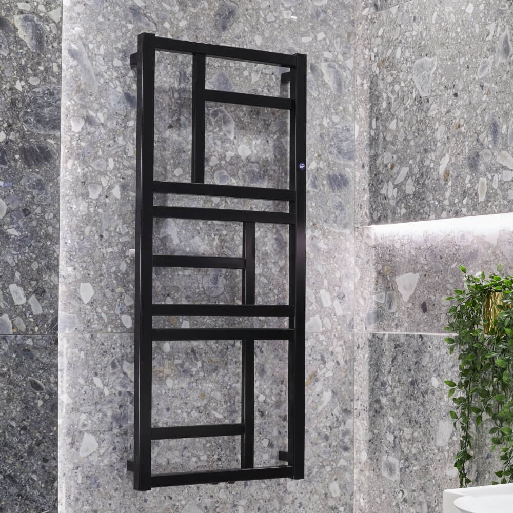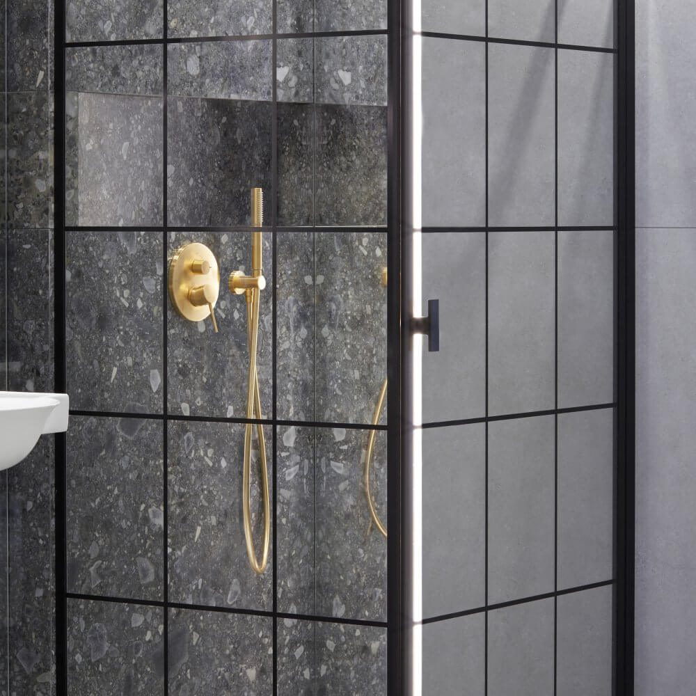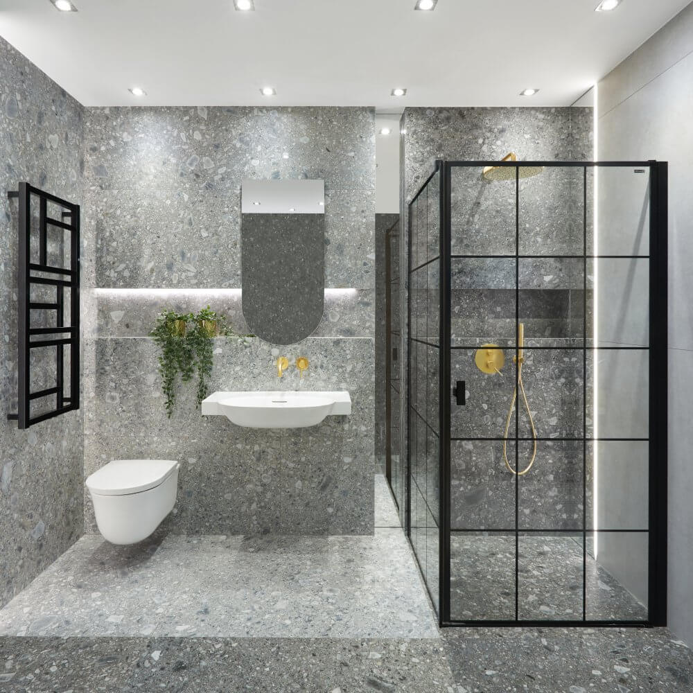 Łazienka z czarnym prysznicem – tło w postaci lastryko