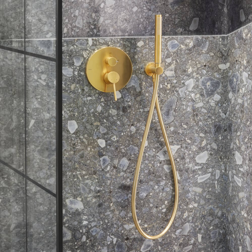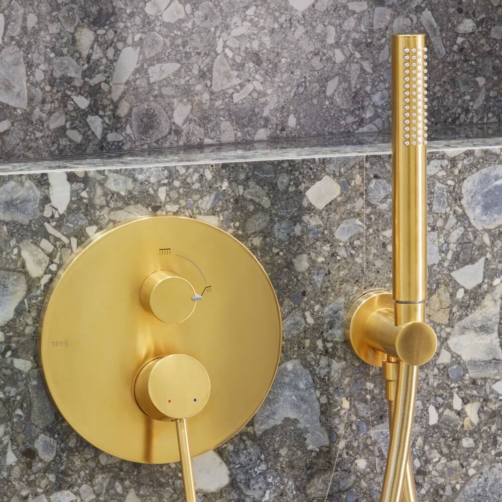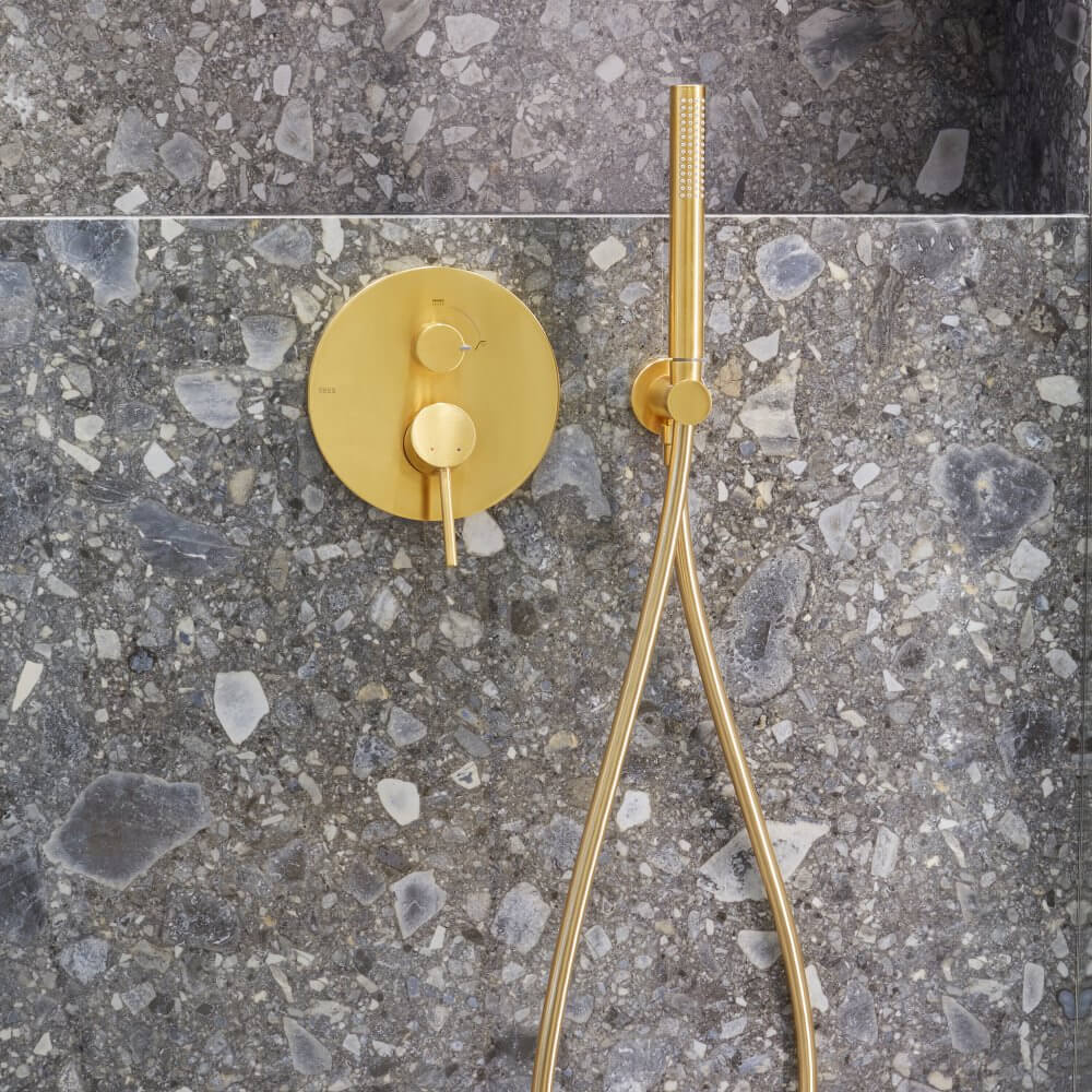 Jakie dodatki będą równoważyć bogate wzornictwo terazzo? My postawiliśmy na zaskakujące połączenie stylów retro i loft. Pierwszy z nich widoczny jest w użytej w projekcie ceramice. Seria New Classic marki Laufen czerpie z blasku minionych epok, wprowadzając do naszej łazienki nutkę nostalgii. To także drugi z filarów wnętrza. Trzeci stanowi złota armatura łazienkowa hiszpańskiej marki Tres. Bateria umywalkowa Study Colors i podtynkowy zestaw prysznicowy zostały zwieńczone matową powłoką o lekko przetartej powierzchni. Przewodnik po naszej aranżacji kończymy na czwartym filarze – czerni. Wyrazisty kolor stał się kontrastującym, a zarazem mocnym punktem projektu. Mała łazienka z czarnym prysznicem oraz czarnym grzejnikiem nabrała loftowego charakteru.