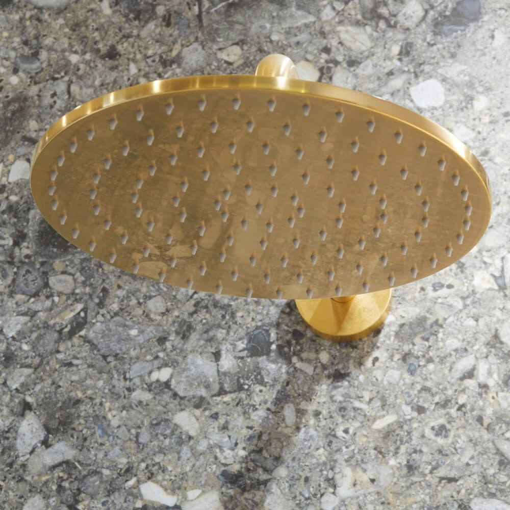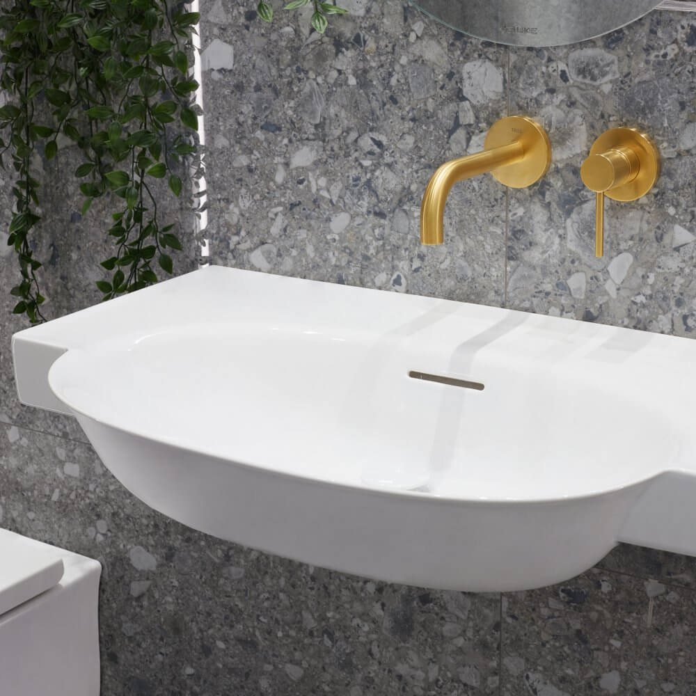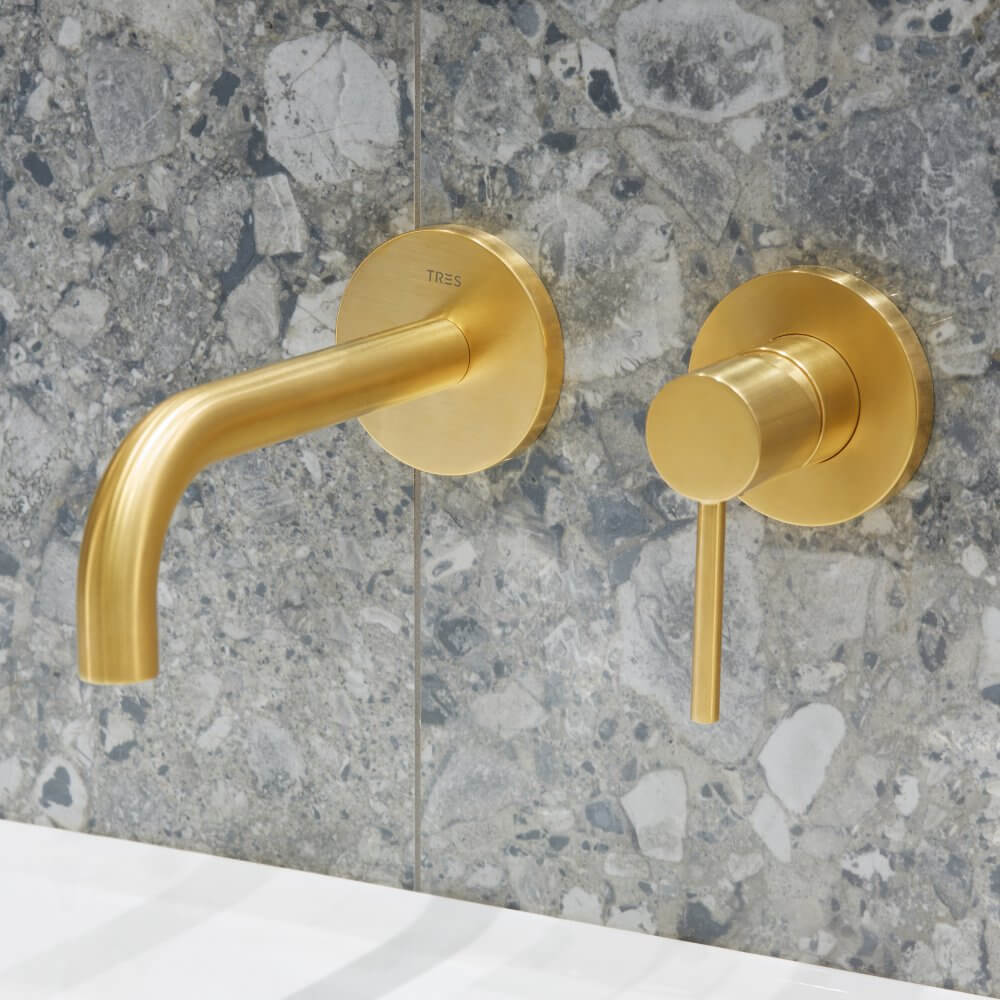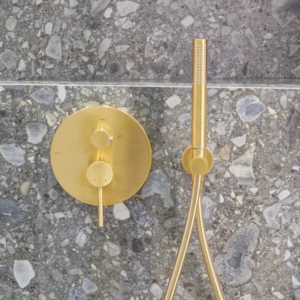 Jakie dodatki będą równoważyć bogate wzornictwo terazzo? My postawiliśmy na zaskakujące połączenie stylów retro i loft. Pierwszy z nich widoczny jest w użytej w projekcie ceramice. Seria New Classic marki Laufen czerpie z blasku minionych epok, wprowadzając do naszej łazienki nutkę nostalgii. To także drugi z filarów wnętrza. Trzeci stanowi złota armatura łazienkowa hiszpańskiej marki Tres. Bateria umywalkowa Study Colors i podtynkowy zestaw prysznicowy zostały zwieńczone matową powłoką o lekko przetartej powierzchni. Przewodnik po naszej aranżacji kończymy na czwartym filarze – czerni. Wyrazisty kolor stał się kontrastującym, a zarazem mocnym punktem projektu. Mała łazienka z czarnym prysznicem oraz czarnym grzejnikiem nabrała loftowego charakteru.