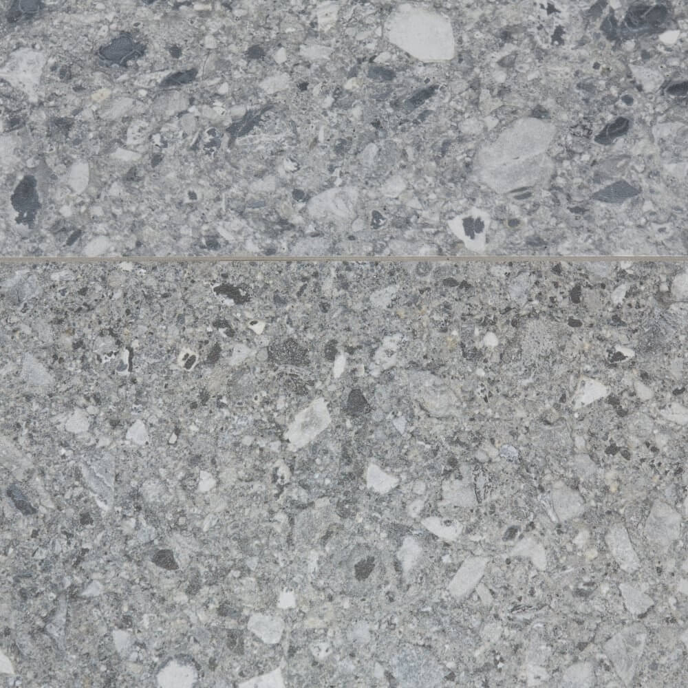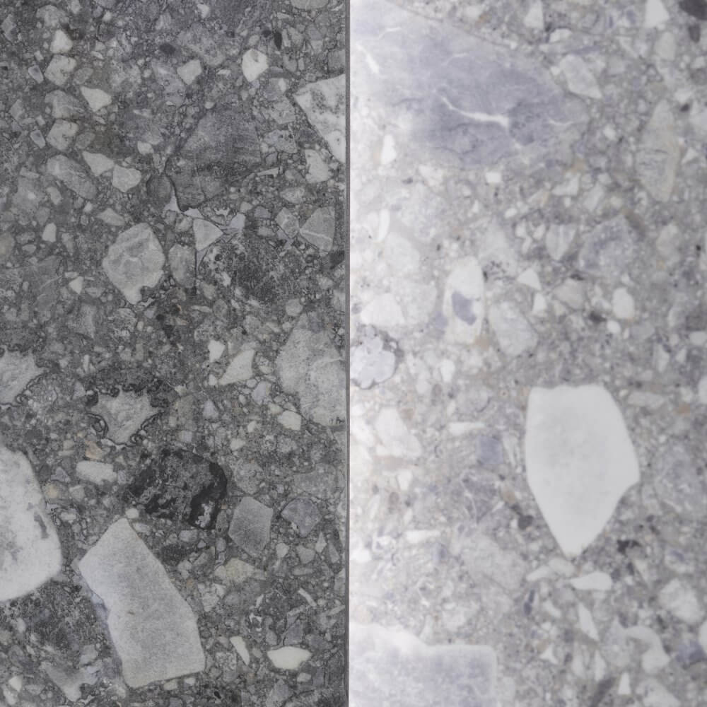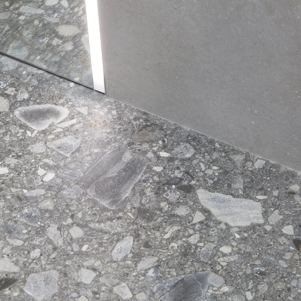W tym projekcie postawiliśmy na kolekcję, która powstała dzięki współpracy marek Cerrad i La Mania Home. Stanowi ona zupełnie nowe spojrzenie na lastryko, czyli materiał, którego powrót do wnętrz świętujemy już od kilku sezonów. To kolekcja Ceppo Nuovo dostępna w dwóch odcieniach: ciemniejszym Graphite oraz jaśniejszym – Ceppo Nuovo Silver. Użycie przez nas dwóch wykończeń powierzchni: matu i poleru jest celowe – w ten prosty sposób wyróżniliśmy wybrane strefy pomieszczenia, nadając im głębi. Projekt łazienki z czarną kabiną uzupełniają płytki imitujące beton od tego samego konceptu o nazwie Modern Concrete Silver Mat. Całość zestawiona ze sobą prezentuje się naprawdę ciekawie, stanowiąc pierwszy z czterech filarów naszego projektu.