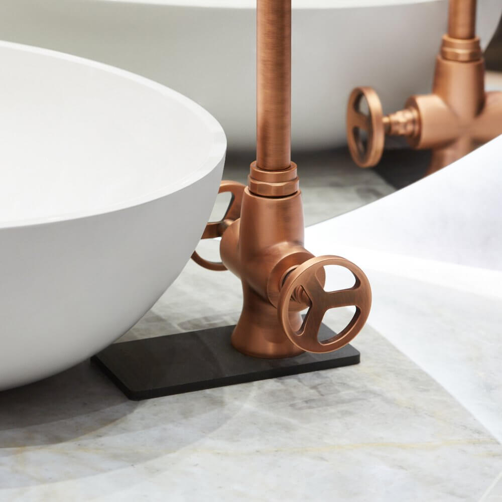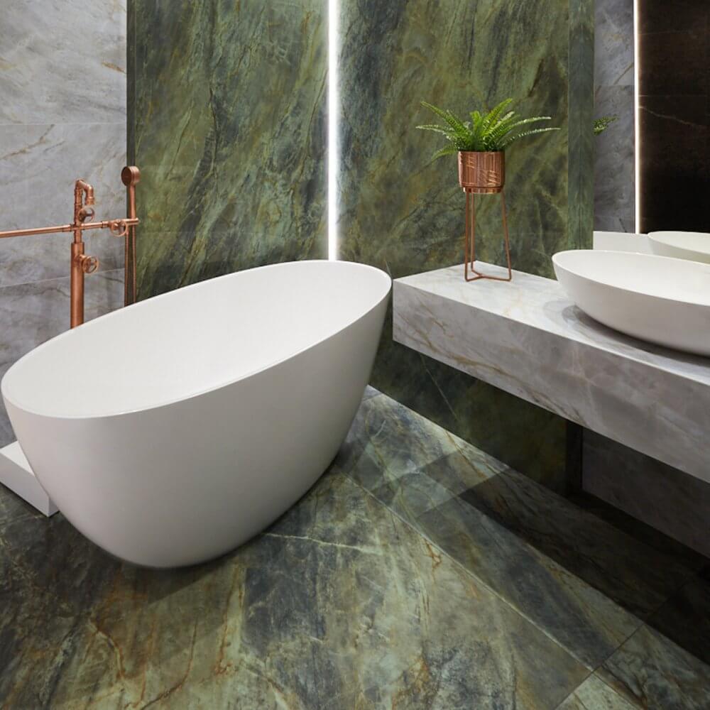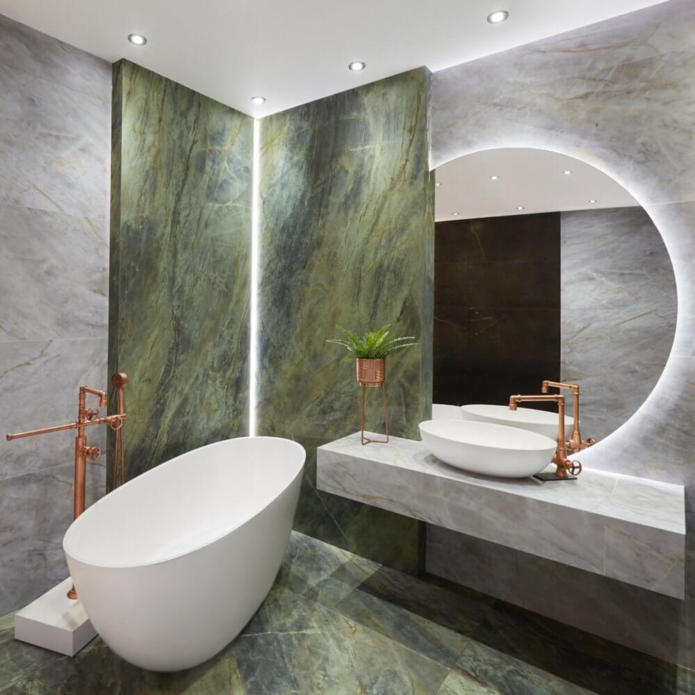 Aranżacja łazienki z płytkami jak kwarcyt łączy nowoczesność z nutką retro. To wnętrze, które zaskakuje kontrastem designu inspirowanego naturą zestawionego z industrialną, miedzianą armaturą i ceramiką o lekkich, opływowych kształtach. Kolekcja płytek ceramicznych imitujących wygląd kwarcytu pozwala na zabawę przestrzenią, budząc emocje.