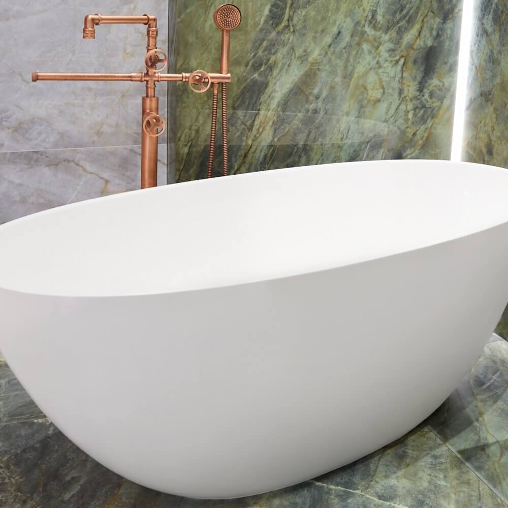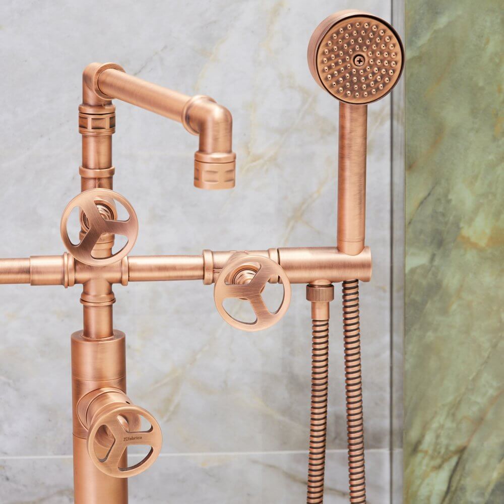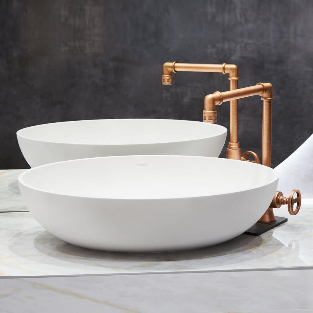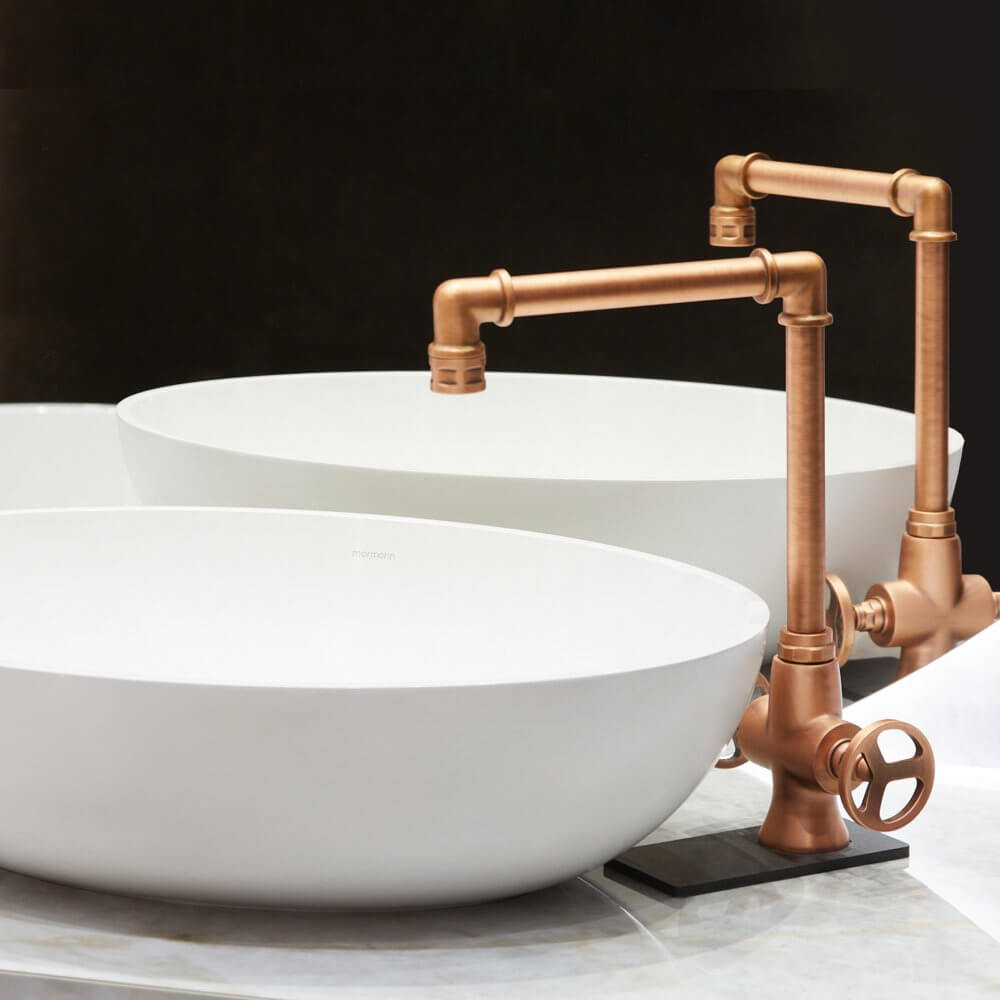 Aranżacja łazienki z płytkami jak kwarcyt łączy nowoczesność z nutką retro. To wnętrze, które zaskakuje kontrastem designu inspirowanego naturą zestawionego z industrialną, miedzianą armaturą i ceramiką o lekkich, opływowych kształtach. Kolekcja płytek ceramicznych imitujących wygląd kwarcytu pozwala na zabawę przestrzenią, budząc emocje.
