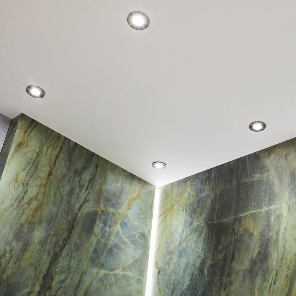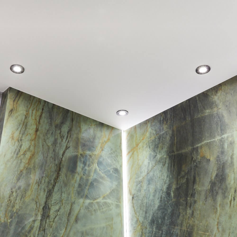 Nasz projekt łazienki z płytkami kamiennymi kwarcyt czerpie z charakterystycznego motywu, który szturmem podbił serca projektantów i architektów. Dwa kolory – zieleń i szarość, idealnie się dopełniają, tworząc intrygującą, żywą przestrzeń. Wykorzystane przez nas płytki ceramiczne pochodzą z nowej kolekcji producenta Cerrad, który podjął owocną współpracę z marką La Mania Home. Przyciągające się barwy to płytki wielkoformatowe Brazilian Quartzite Green oraz płyta kwarcyt Natural. Szaro zielona łazienka to także zestawienie dwóch kontrastujących wykończeń – matu i poleru. Połączenie to jest estetyczne, ale także bardzo praktyczne, optycznie powiększając przestrzeń. W naszym projekcie nie zapomnieliśmy także o odpowiednim oświetleniu. Zainstalowane w suficie, podtynkowe, ruchome oczka Gapis Move R Black pięknie doświetliły przestrzeń, łącząc się z blaskiem listew LED.
