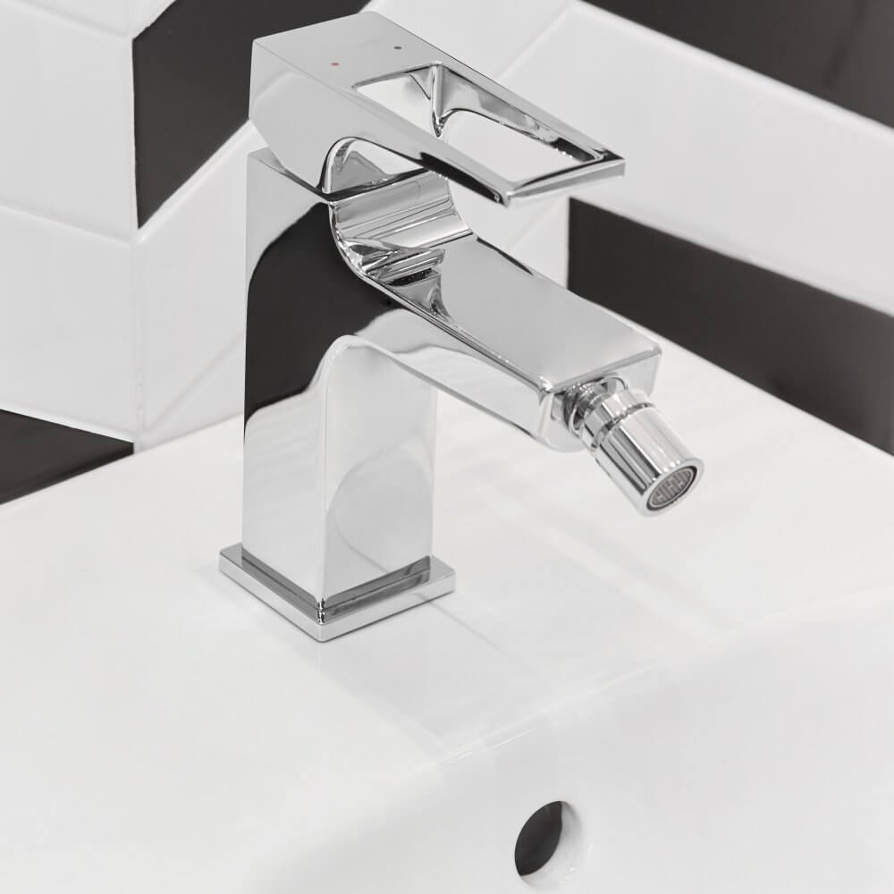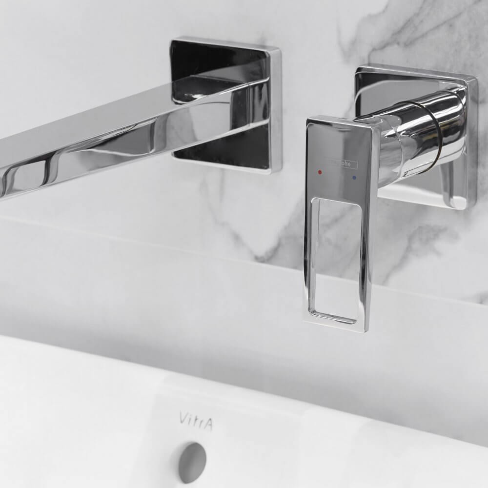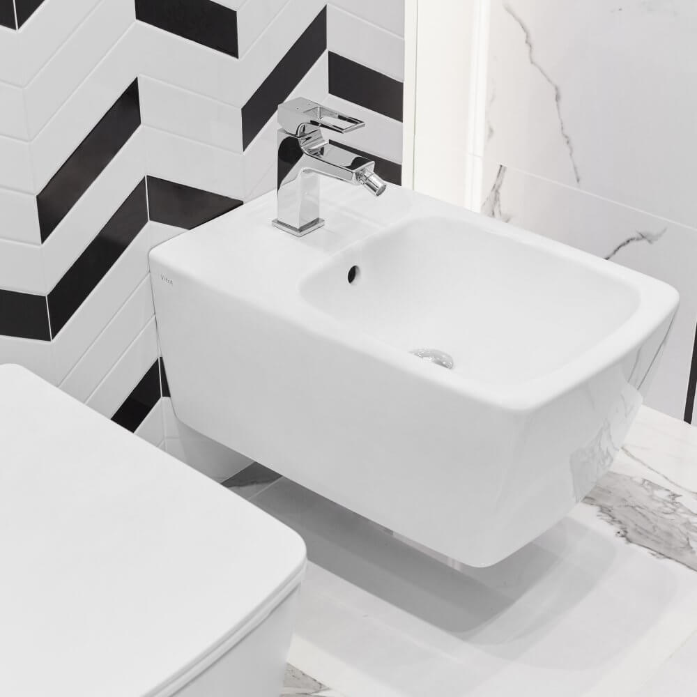 W tej aranżacji dążymy do minimalizmu. Podczas wyboru wykończenia, zdecydowaliśmy się więc na klasyczną, chromowaną armaturę, która dopełnia białą ceramikę łazienkową o geometrycznych rysach. Kafle metro zdobiące naszą łazienkę dopełniliśmy miską podwieszaną Metropole Rimless, która z deską wolnoopadającą Slim Soft pozwoliła nam stworzyć praktyczny zestaw. Tuż obok zawisnął bidet podwieszany, Vitra uzupełniony o baterię bidetową Chrom Loop Metropol, Hansgrohe. Na zbudowanym przez nas blacie stanęła elegancka umywalka o lekko zaoblonych brzegach, dopełniona błyszczącą baterią umywalkową podtynkową Metropol. Ostatnim elementem w naszym projekcie jest duże, okrągłe lustro, którego ramę stanowi wyraziste oświetlenie LED.