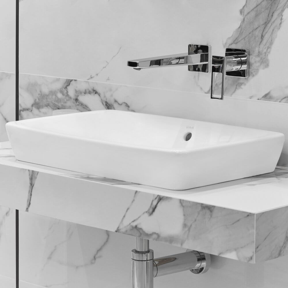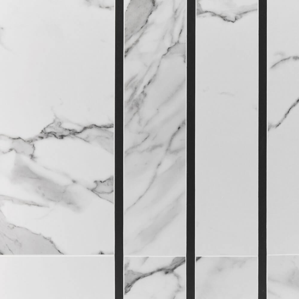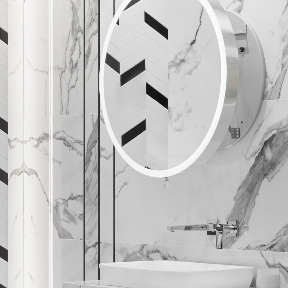 Aranżując tę łazienkę, podążaliśmy za trendami. Nasz wzrok niemal od razu padł na inspirację marmurem – płytki Calacatta White Poler 119,8x59,7, Cerrad doskonale odnalazły się w roli głównego motywu we wnętrzu. Ich polerowana powierzchnia przepięknie odbija kompozycje świetlne, znajdujące się w aranżacji. Aby przełamać powierzchnię pełną eleganckich użyleń, postawiliśmy w naszej łazience w stylu metro na duochromatyczny duet czerni i bieli, który stanowi nowoczesne spojrzenie na inspirowane nowojorskim metrem kafle. Ułożenie ich we wzór jodełki dodało charakteru całemu pomieszczeniu. Wyrazisty motyw nadał także wyjątkowości minimalistycznej kompozycji, a zastosowanie liniowego oświetlenia oraz luster optyczne powiększyło powierzchnię łazienki.