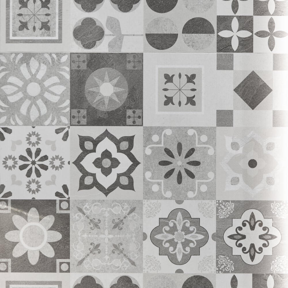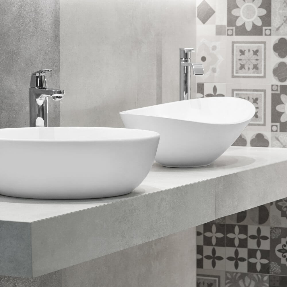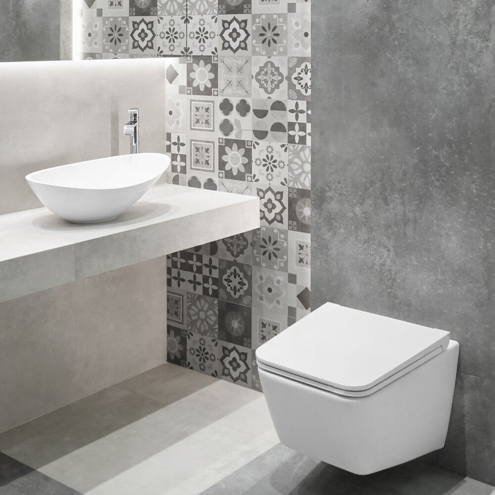 W naszym projekcie zdecydowaliśmy się na płytki imitujące beton w dwóch odcieniach. Taki zabieg świetnie zorganizował przestrzeń i nadał jej wielowymiarowości. Z pewnością zwróciłeś uwagę na dekor ścienny, który przełamuje monotonię jednej ze ścian. Pomimo szarej barwy, stanowi on ciekawe dopełnienie całej aranżacji - dzięki różnorodnemu wzornictwu płytek patchwork uzyskaliśmy w szarej łazience przytulny rys. Aby nasz projekt mógł upiększać nawet najmniejsze pomieszczenia, zdecydowaliśmy się wykorzystać w nim duże, podłużne lustro.