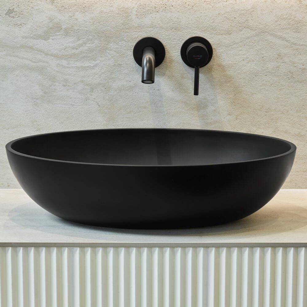 W tej eleganckiej łazience panuje wyjątkowy klimat, który wyznacza harmonijne połączenie surowości i nowoczesności. Główną rolę odgrywają tu beżowe płytki The Rock Trarge, których tekstura przypominająca naturalną skałę nadaje wnętrzu charakteru i głębi. Zarówno na ścianach, jak i na podłodze, te płytki tworzą spójną całość, podkreślając unikalny styl pomieszczenia. Kontrastowy akcent wprowadza biały, ryflowany panel ścienny Flex marki Orac Decor, który otacza blat umywalkowy. Na tym wyjątkowym blacie znajduje się czarna, matowa umywalka nablatowa Birma, wraz z elegancką, czarną baterią podtynkową. Te czarne elementy dodają łazience elegancji i nowoczesności, tworząc wyrazisty kontrast z jasnymi płytkami.