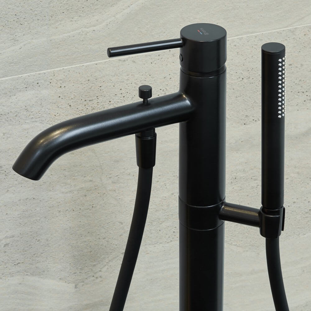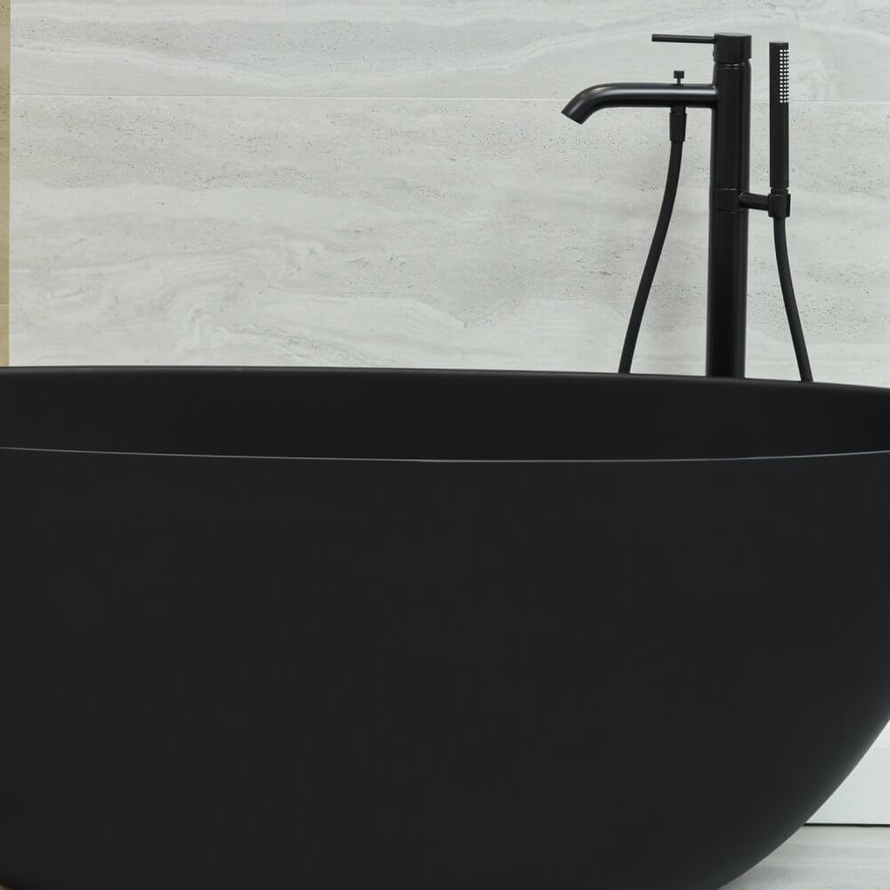 W centrum łazienki stanęła imponująca wanna wolnostojąca w czerni, która przyciąga uwagę swoim minimalistycznym designem. Obok niej znajduje się czarna bateria wannowa stojąca, harmonijnie dopełniająca aranżację. Nad umywalką wisi duże, podłużne lustro, które optycznie powiększa przestrzeń i dodaje jej lekkości. Dzięki oświetleniu LED zamontowanemu za lustrem światło jest równomierne i przyjemne dla oka, podkreślając każdy detal aranżacji. Aby dopełnić atmosferę komfortu, w łazience znajduje się biały, podłużny kaloryfer, który nie tylko zapewnia ciepło, ale również stanowi estetyczny dodatek, pasujący do reszty elementów wystroju.