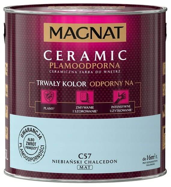 MAGNAT CERAMIC, ceramiczna farba do wnętrz, trzeciej generacji, wyprodukowana przy wykorzystaniu innowacyjnej technologii CERAMIC SYSTEM bazującej na ceramicznych komponentach oraz najwyższej jakości żywicach i pigmentach.