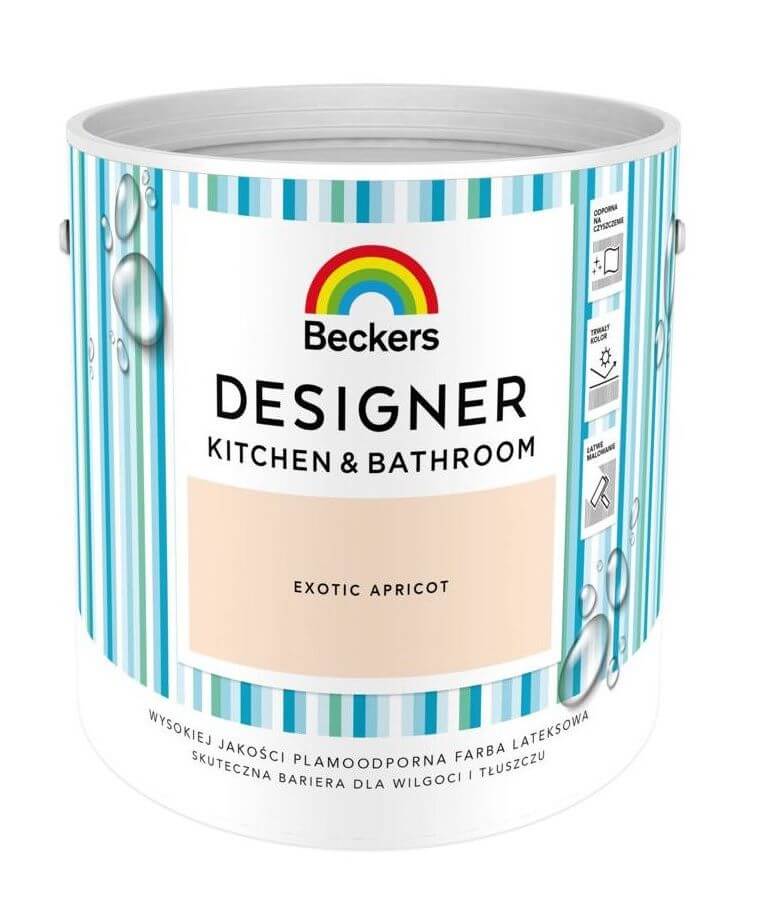 Beckers Designer Kitchen & Bathroom to wysokiej jakości, wodorozcieńczalna farba lateksowa, szczególnie polecana do stosowania w pomieszczeniach narażonych na rozwój grzybów pleśniowych, działanie wilgoci oraz pary wodnej występującej w kuchniach i łazienkach.- Najwyższa klasa odporności na szorowanie na mokro wg normy PN-EN 13300;