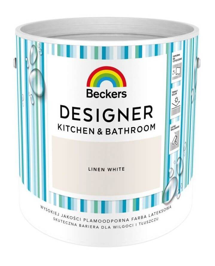 Beckers Designer Kitchen & Bathroom to wysokiej jakości, wodorozcieńczalna farba lateksowa, szczególnie polecana do stosowania w pomieszczeniach narażonych na rozwój grzybów pleśniowych, działanie wilgoci oraz pary wodnej występującej w kuchniach i łazienkach.- Najwyższa klasa odporności na szorowanie na mokro wg normy PN-EN 13300;