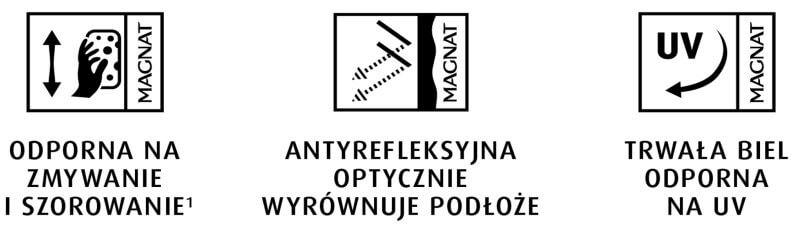 MAGNAT Creative White 2,5L to lateksowa, głęboko matowa i antyrefleksyjna farba polecana do malowania dużych powierzchni. Antystatyczna powłoka, zmniejsza efekt przywierania kurzu do ścian. Farba nie chlapie podczas malowania i charakteryzuje się bardzo dobrą przyczepnością do podłoża. MAGNAT Creative White przeznaczona jest do dekoracyjno-ochronnego malowania ścian i sufitów z zapraw cementowych, cementowo-wapiennych, gipsowych, cegły, płyt gipsowo-kartonowych, drewnianych, drewnopochodnych oraz tapet, również tych z włókna szklanego użytkowanych wewnątrz pomieszczeń.