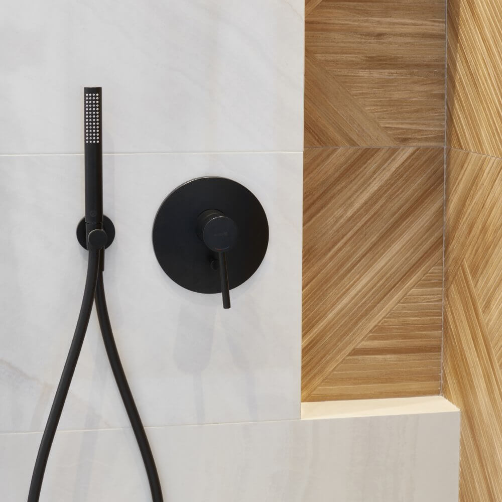 Kamień i drewno tworzą wyjątkową atmosferę. Te dwa naturalne materiały doskonale się uzupełniają, tworząc harmonijną kompozycję. Płytki Onyx Ciemnobeżowe i Jasnobeżowe Rako dodały łazience luksusowego i ekskluzywnego charakteru, podkreślając elegancję wnętrza. Zastosowanie ich na ścianach, podłogach, a także w postaci blatu, zapewniło niezwykłą harmonię. Okładzina ścienna pod prysznicem, czyli płytki imitujące drewno Madera, dodają z kolei ciepła i przytulności, nadając wnętrzu naturalnego i przyjaznego wyglądu. Ich faktura i kolor przemycają pożądany kontrast. Ta połączona kompozycja stanowi doskonałe rozwiązanie dla osób, które cenią sobie dobry design i wysoką jakość wykończenia przestrzeni łazienkowej.