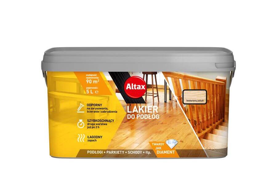 Lakiery do drewna marki Altax to produkty, po które sięga wielu naszych klientów. Są niezawodne, łatwe w użyciu i odporne. Pozwalają znacznie podnieść właściwości użytkowe podłogi wykonanej z naturalnych desek i uodpornić jej powierzchnię na skutki intensywnej eksploatacji. Altax do podłóg w pojemności 5l o bezbarwnej barwie doskonale podkreśli odcień posadzki oraz wyjątkowy rysunek słojów i sęków. Dodatkowo stworzy na podłodze powłokę w połyskującym wykończeniu, która będzie dodawać wnętrzom blasku. Lakier ten przeznaczony jest do stosowania wewnątrz pomieszczeń na oszlifowane powierzchnie podłóg, schodów, parkietów i progów. Altax Lakier do podłóg bezbarwny wyróżnia się krótkim czasem schnięcia, łagodnym zapachem i łatwą aplikacją. Kolor bezbarwny można nakładać za pomocą pędzla lub wałka – zalecane jest nakładanie 3 warstw lakieru w sposób rekomendowany przez producenta.