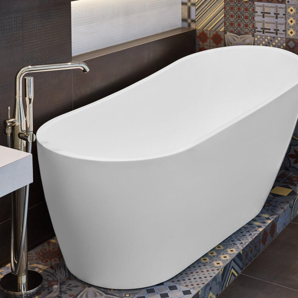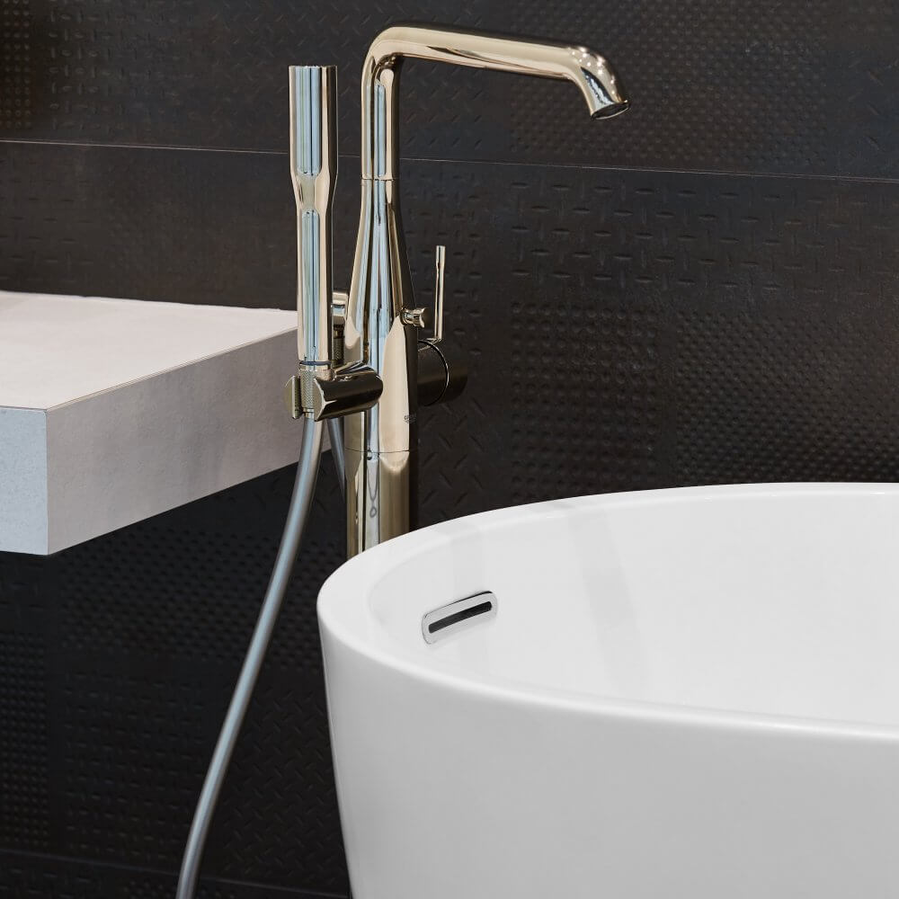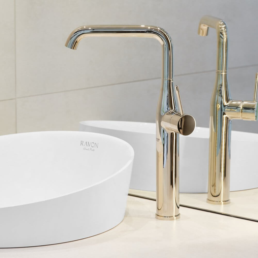 Ciemnobrązowy motyw, choć przełamany przez nas beżem, najmocniej przykuwa wzrok. By zrównoważyć jego ciemny odcień, w naszym projekcie wykorzystaliśmy białą ceramikę łazienkową. W aranżacji marokańskiej łazienki z pewnością zwróciłeś uwagę na wannę wolnostojącą o kształcie muszli. Postawiliśmy przy niej baterię wannową wolnostojącą Essence Polished Nickel, Grohe. Jej złota barwa wprost nawiązuje do pełnych przepychu, orientalnych wnętrz. Estetykę tą zauważyć możesz także obok umywalki nablatowej, gdzie wykorzystaliśmy baterię z tej samej serii. Biel posłużyła nam także podczas wyboru miski WC. Naszą aranżację łazienki w stylu orientalnym dopełniliśmy zestawem Norm, GSI – podwieszaną, bezrantową toaletą oraz deską Soft Close.