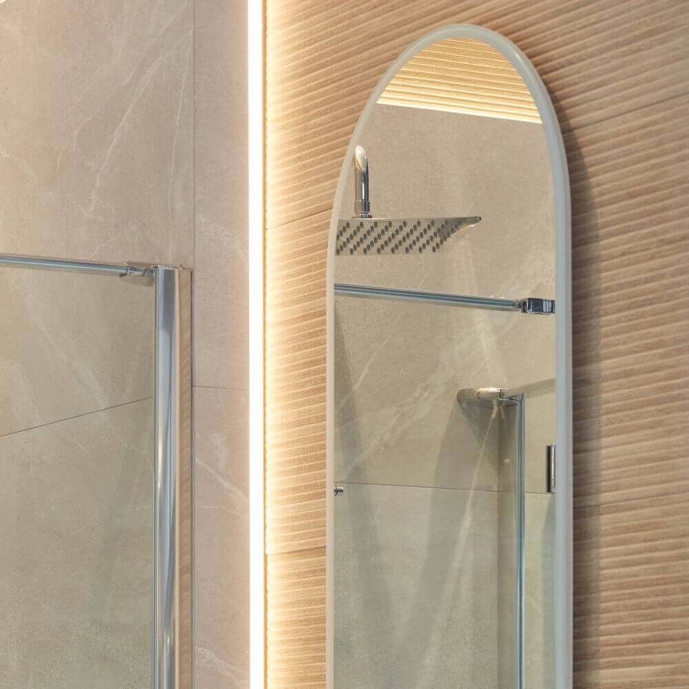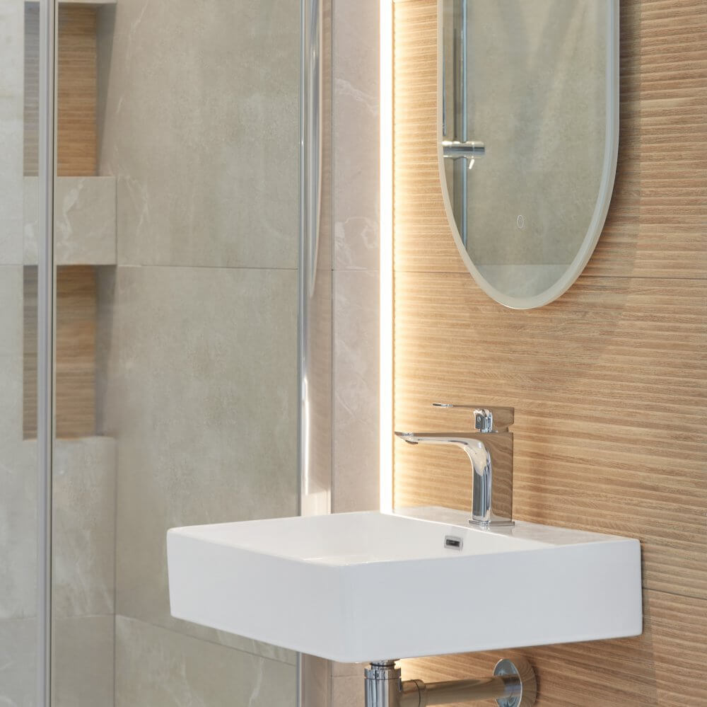 W małych pomieszczeniach przytłacza jednolitość formy i kształtu, dlatego żeby przełamać ten kanon zdecydowaliśmy się na zróżnicowanie powierzchni. Wysunięta ścianka strefy prysznicowej została obudowana płytkami imitującymi kamień Babilon Beige marki Ceramica Limone. Kamienne kafelki wykończone w półpołysku świetnie sprawdzą się w miejscach narażonych na stały kontakt z wodą. A ich beżowa kolorystyka idealnie współgra z drewnopodobnymi płytkami ściennymi Larchwood Alder od Baldocer, które pokrywają pozostałą część ścian.