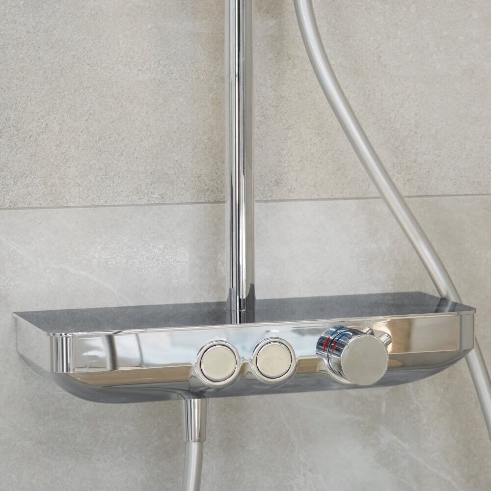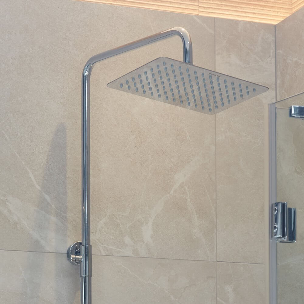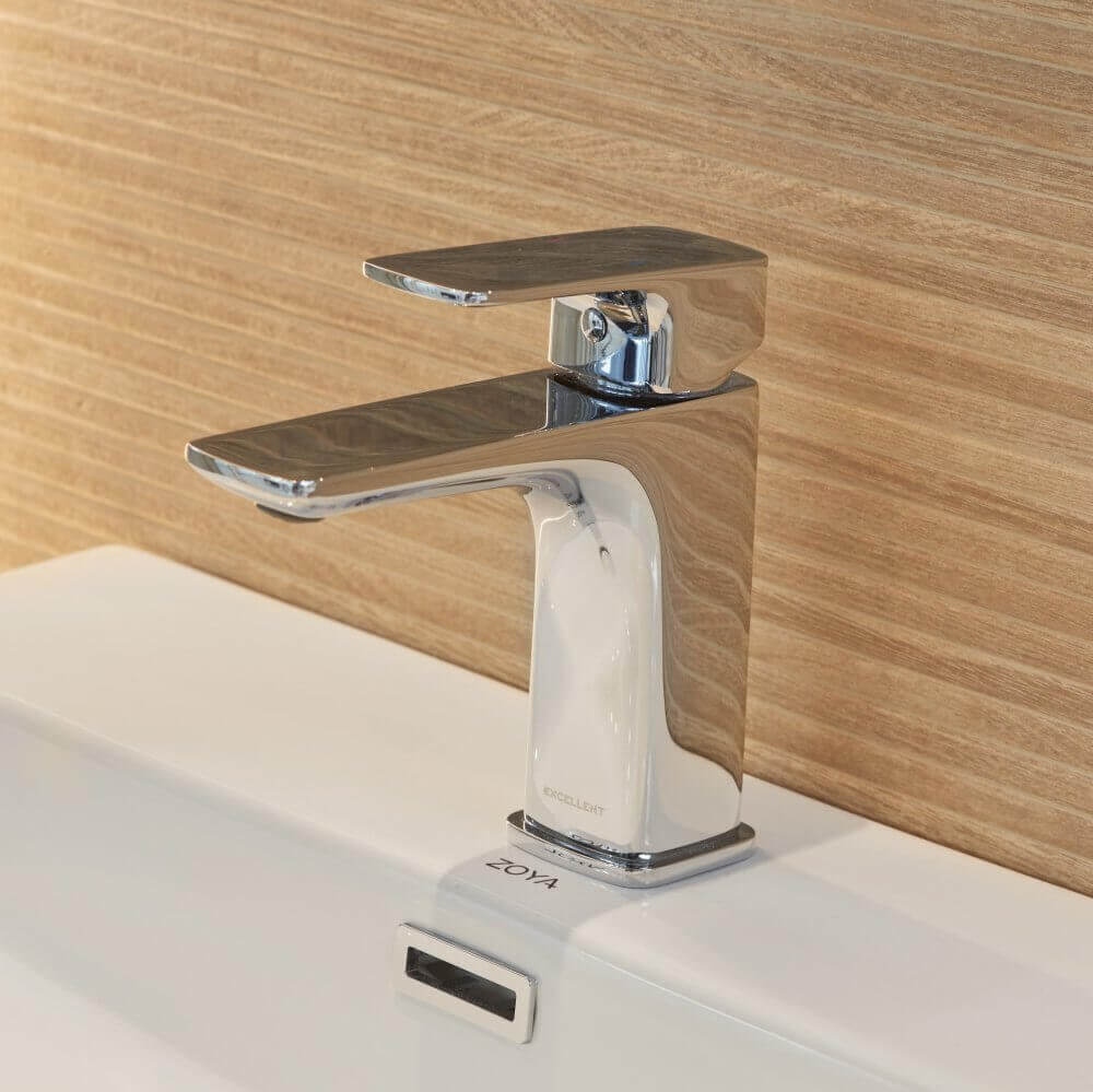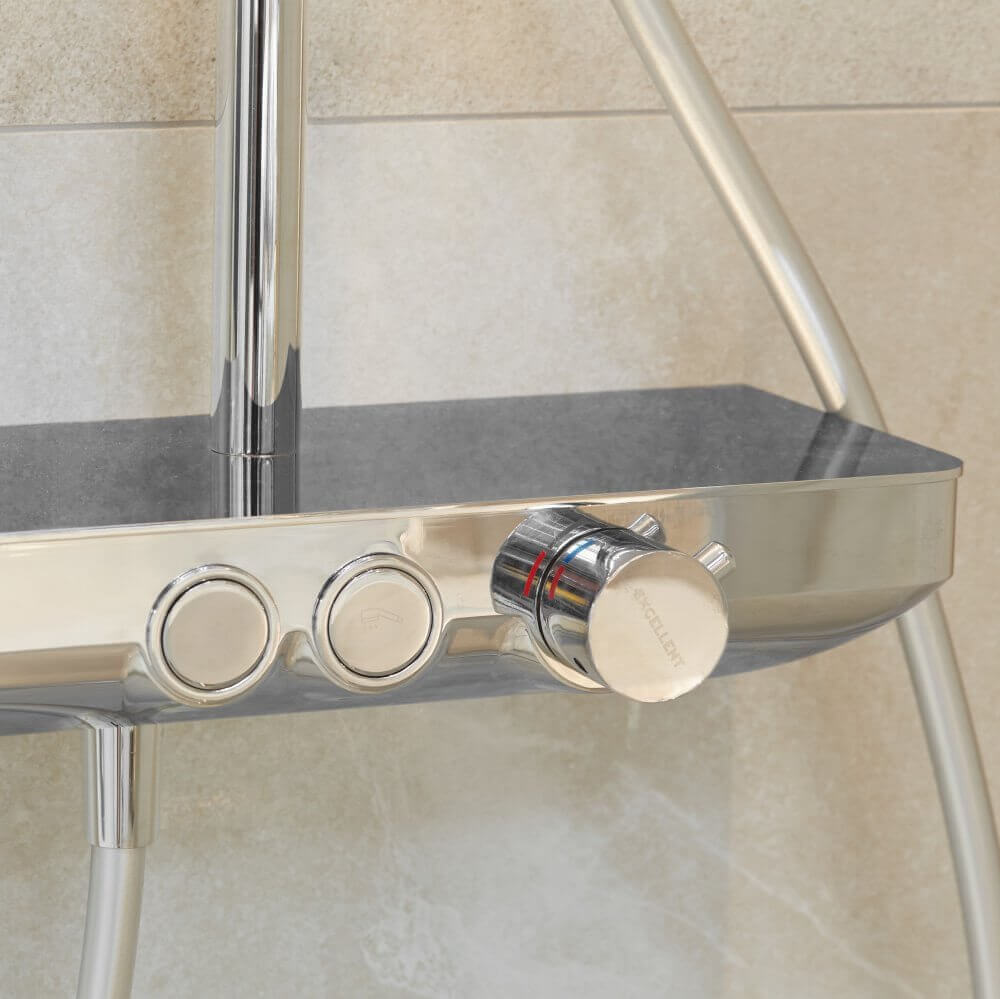 Pięciokątna kabina prysznicowa wykończona chromem narzuciła wybór armatury prysznicowej. Zestaw prysznicowy Krotos Chrom marki Excellent wyposażony w deszczownicę i ceramiczną głowicę Easy-Click sprawi, że codzienna kąpiel będzie prawdziwą przyjemnością. W strefie umywalkowej znalazła się bateria umywalkowa Keria Excellent, pasująca kolorem do zestawu.