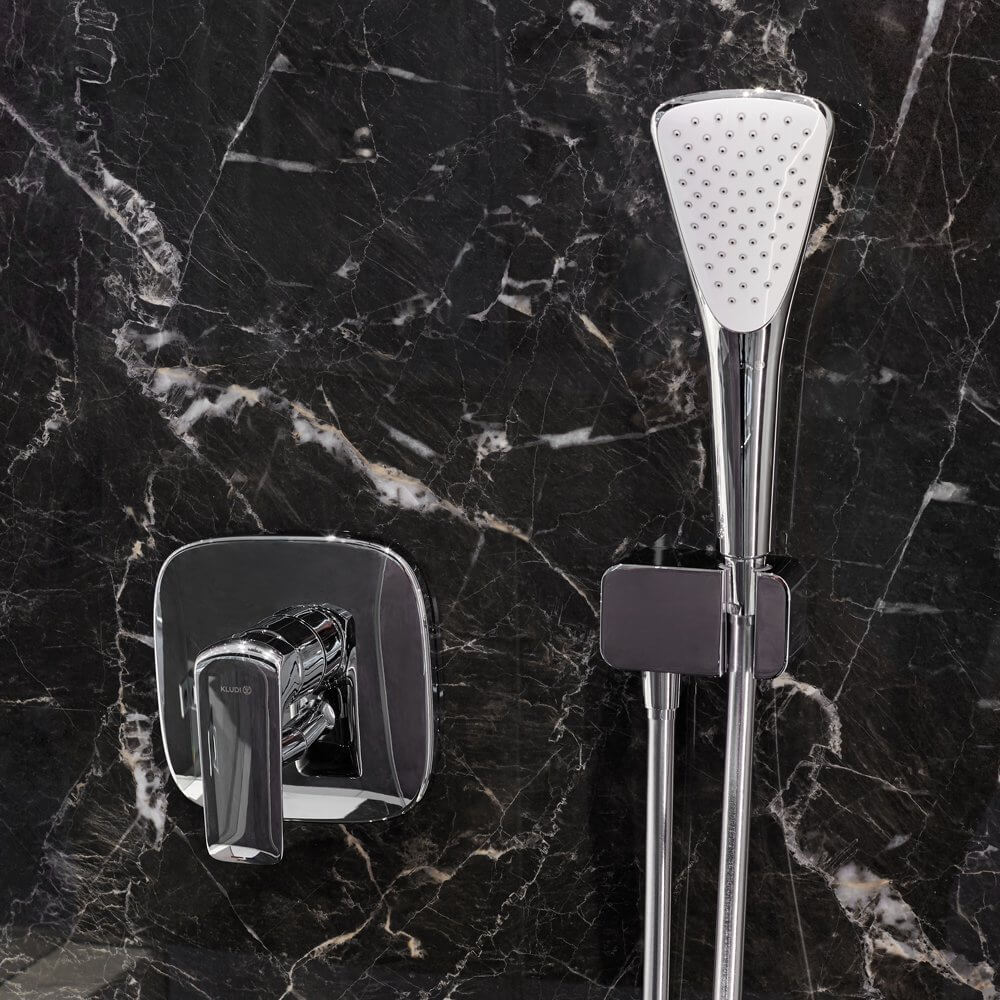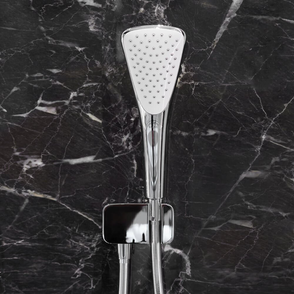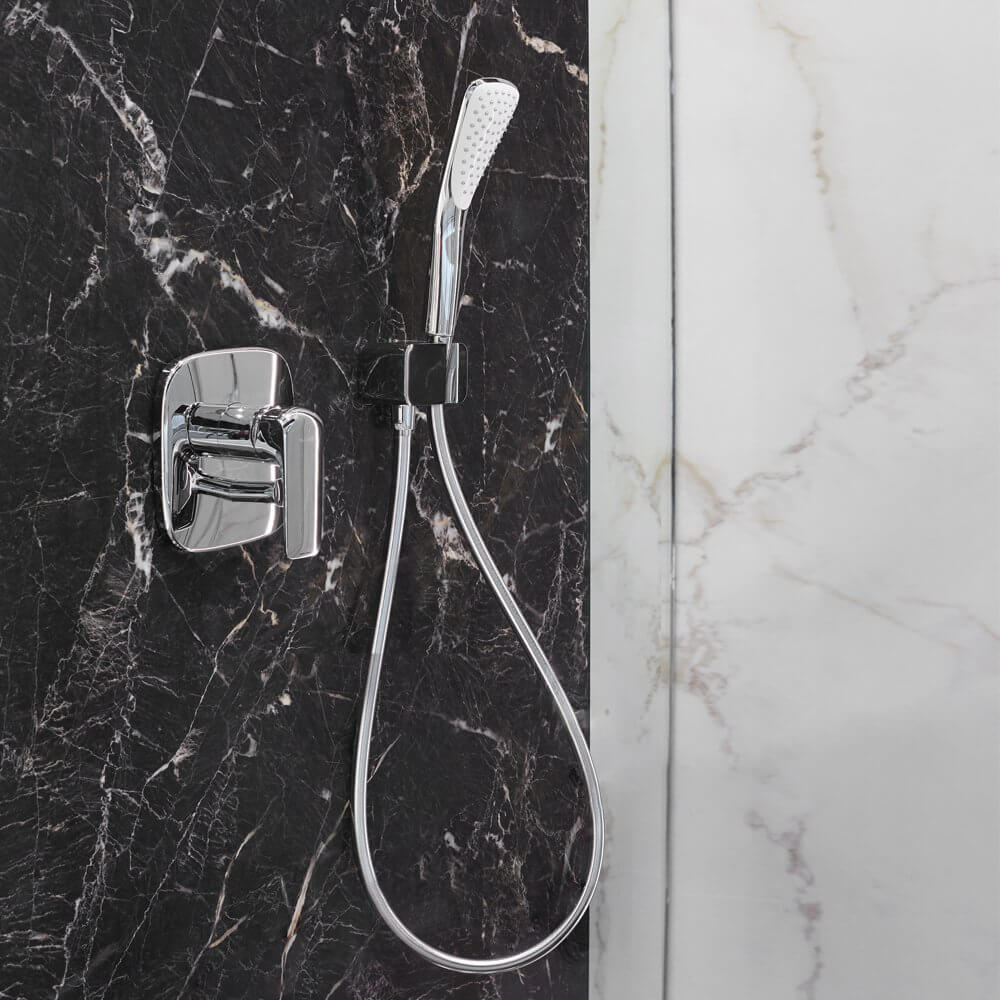 Aby nasza łazienka zyskała nowoczesnego akcentu zastosowaliśmy ceramikę o ostrych kształtach i minimalistycznej formie. Wanna z hydromasażem Inspire Pryzmat Slim marki Excellent oraz umywalka Pro S od Laufen doskonale uzupełniają naszą marmurową aranżację. Całość ozdabia armatura marki Kludi, która dzięki swoim uniwersalnym kształtom świetnie podkreśla nowoczesny charakter łazienki.