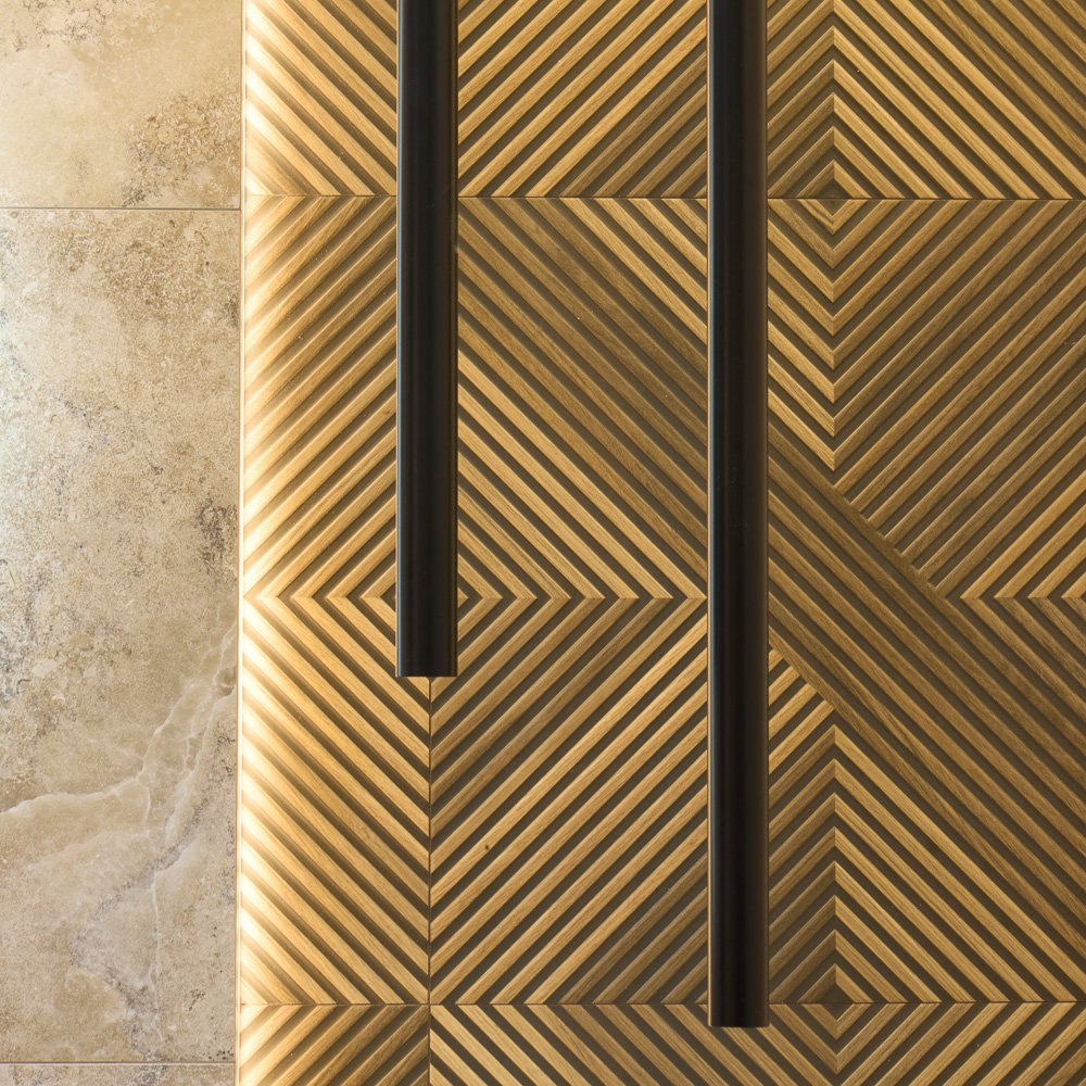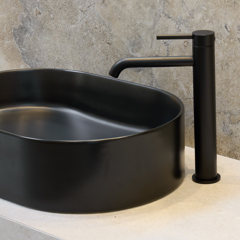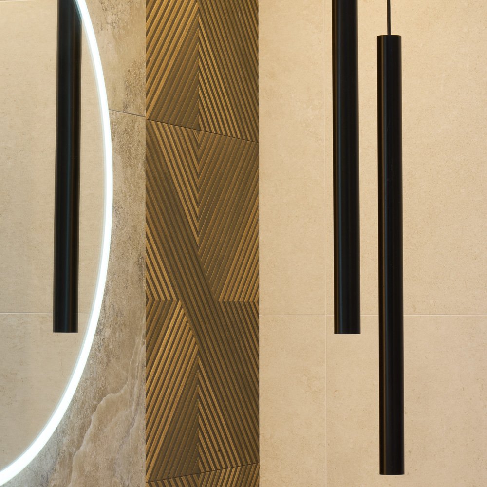 Nowoczesna łazienka z płytkami Stone Art White i czarną ceramiką
