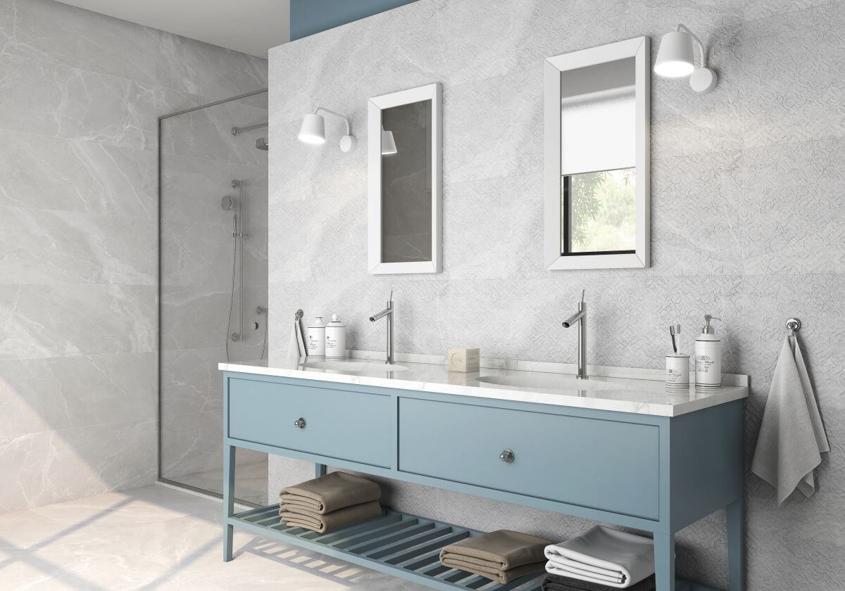 Odkryj na nowo piękno kamienia, dzięki płytkom ceramicznym Babilon Silver 60x120 od marki Ceramica Limone. Ich wygląd łączy w sobie urok skalnych tafli o jasnym, szarym wybarwieniu z nowoczesną powierzchnią wykończoną w półpolerze. To dzięki niej płytki prezentują się gustownie i wyraziście, zachwycając zarówno za dnia, w pełnym słońcu, jak i po zmroku, oświetlone subtelną poświatą. Zobacz ich wyjątkowe szczegóły w naszej aranżacji łazienki z niebieskimi płytkami, w której uzupełniliśmy je drewnem i dekoracyjnymi kafelkami.