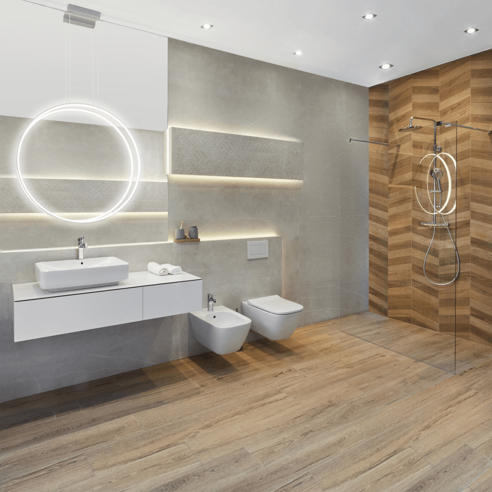 Połączenie beżu i brązu to bardzo atrakcyjne rozwiązanie. Fuzja faktur i barw z tej samej gamy kolorystycznej pozwoliła na uzyskanie łazienki pełnej wyrafinowania. W tym projekcie wykorzystaliśmy różne rodzaje płytek ceramicznych, które razem stworzyły spójną całość. Pierwsze z nich to płytki imitujące kamień - Nickon Bone od Novabell. Odcień kości słoniowej jest cieplejszy niż klasyczna biel, ale chłodniejszy niż krem, co stało się idealnym wyborem do naszej aranżacji. Połączyliśmy je z płytkami dekoracyjnymi Nickon Bone Han. Teksturowane ściany nadają łazience zniewalającą, ale spokojną atmosferę. Ostatnim, ale nie mniej ważnym elementem całej łazienki są płytki drewnopodobne Nordic Wood Blonde Spina oraz Nordic Wood Blonde Flamed Mat. One pozwoliły nam na wprowadzenie naturalnego motywu i organizacji całej przestrzeni.