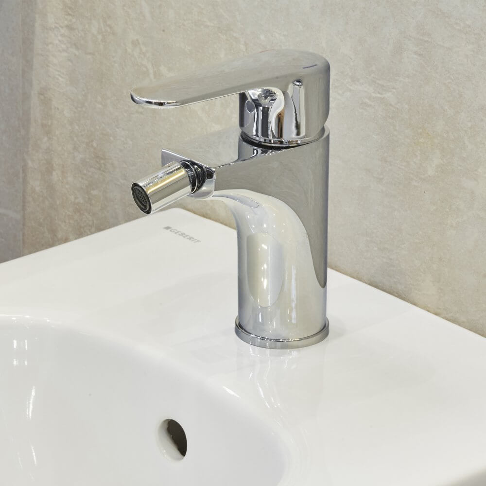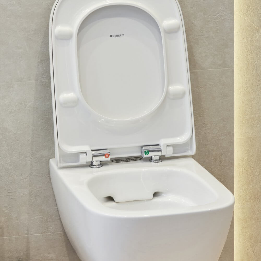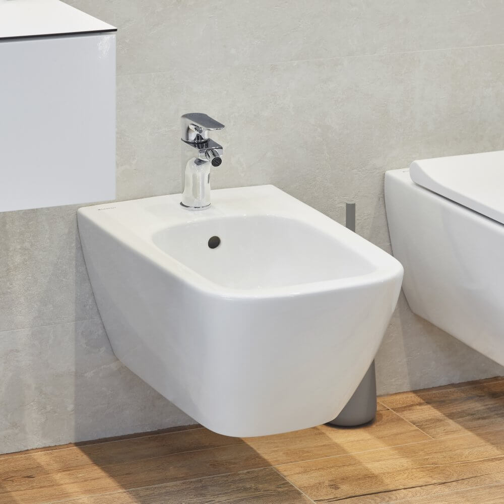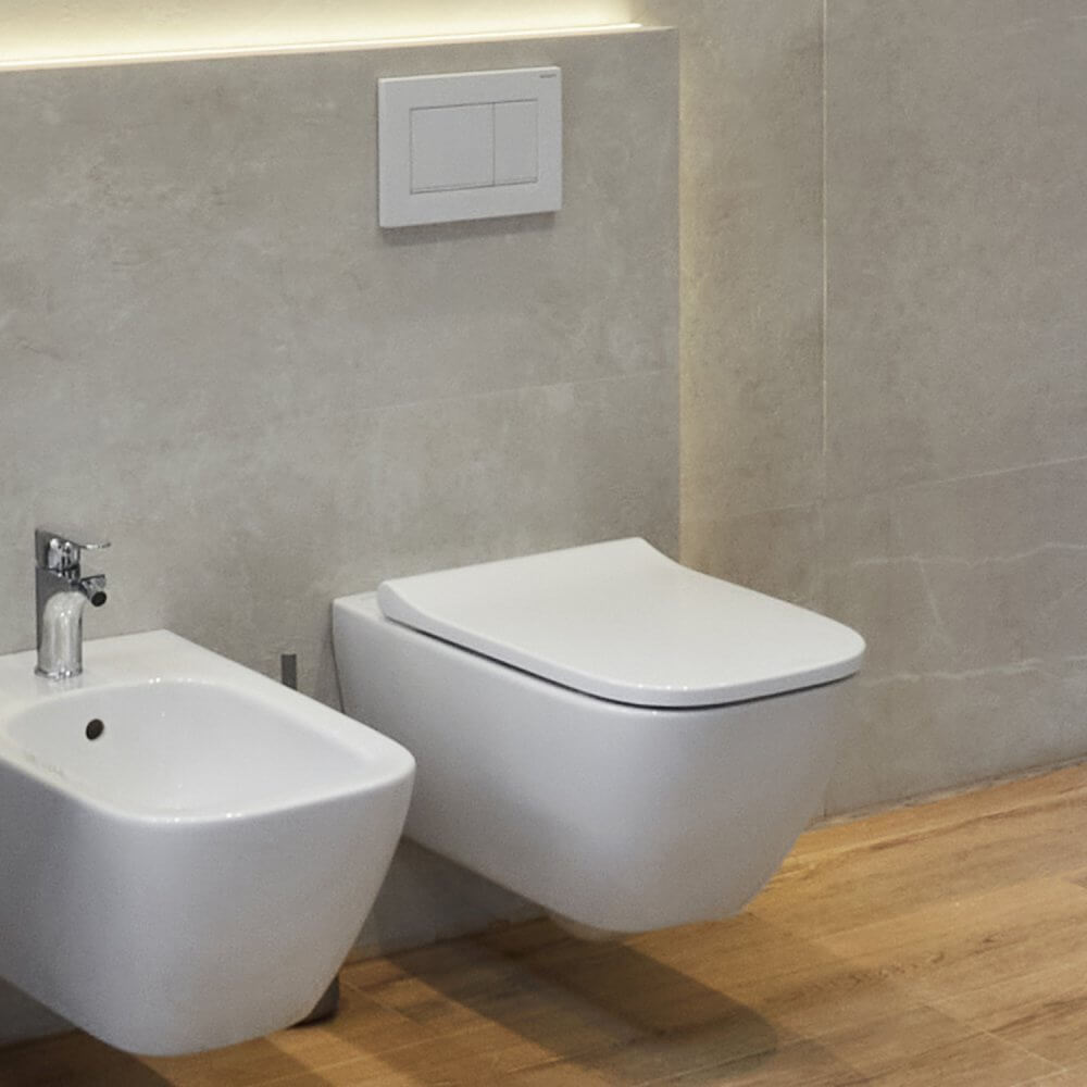 Aby nie zakłócić całości aranżacji, postawiliśmy na prostą, ale jakże efektowną ceramikę łazienkową. Strefa umywalkowa składa się z szafki wiszącej, na której dumnie stanęła umywalka nablatowa, uzupełniona chromowaną baterią Vitra Root Round. Nad nimi zawisło lustro marki Elita, które oświetliliśmy nowoczesną lampą wiszącą Ronda Top M White. Ta strefa to zdecydowanie synonim nowoczesności. Obok zorganizowaliśmy strefę toalety, którą wypełniają miska wisząca z deską wolnoopadającą Slym Square oraz bidet wiszący, również uzupełniony baterią Vitra. Nie zapomnieliśmy o strefie prysznicowej, gdzie dumnie stoi kabina prysznicowa walk-in wraz z kolumną natryskową Aqua Heat Joy.