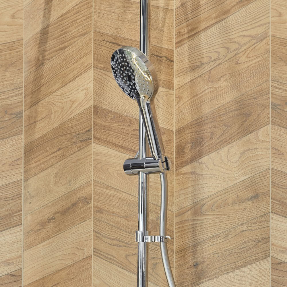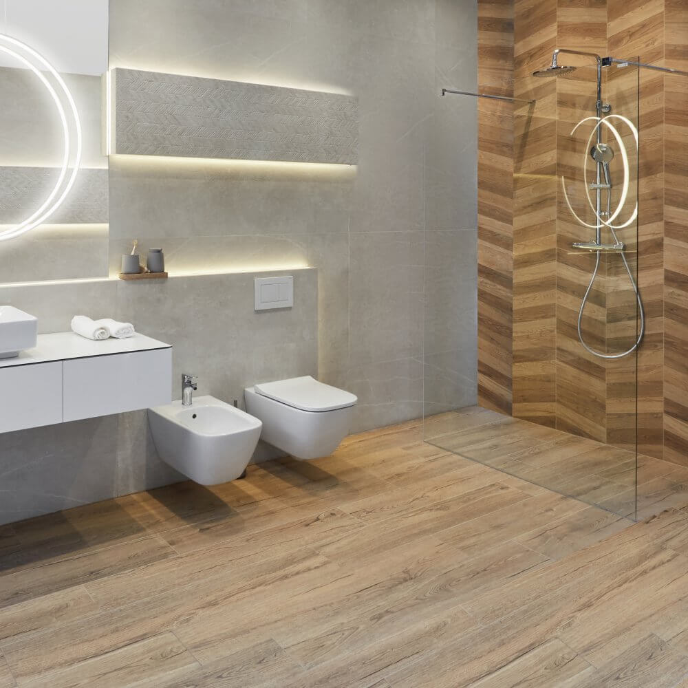Szukasz sposobu na zastosowanie płytek drewnopodobnych w łazience? Zobacz naszą aranżację, w której harmonijnie połączyliśmy kamień i drewno. Całość uzupełniliśmy białą ceramiką łazienkową i modnymi dodatkami.