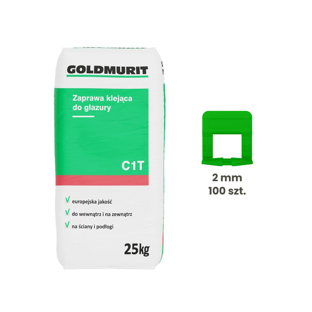 - / Zestaw Zaprawa Klejąca Do Glazury 25kg + Klipsy Do Poziomowania Płytek 2 mm Zielone 100 Szt. Goldmurit